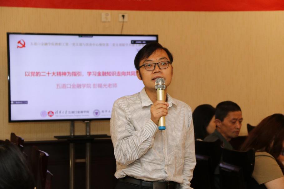 金融学院党委委员、教职工第一党支部书记张伟介绍了金融学院的基本情况,以及第一党支部的党建情况。金融学院第一党支部包括教学办、学生办、MBA中心、校友办、校友发展研究中心、学生健康发展中心和《清华金融评论》编辑部。近年来,金融学院第一党支部举办了丰富的共建活动,以解决问题为导向,力求贴近全体教职工的需求,从而进一步推动了支部工作与各项工作的“双融合、双提高”。