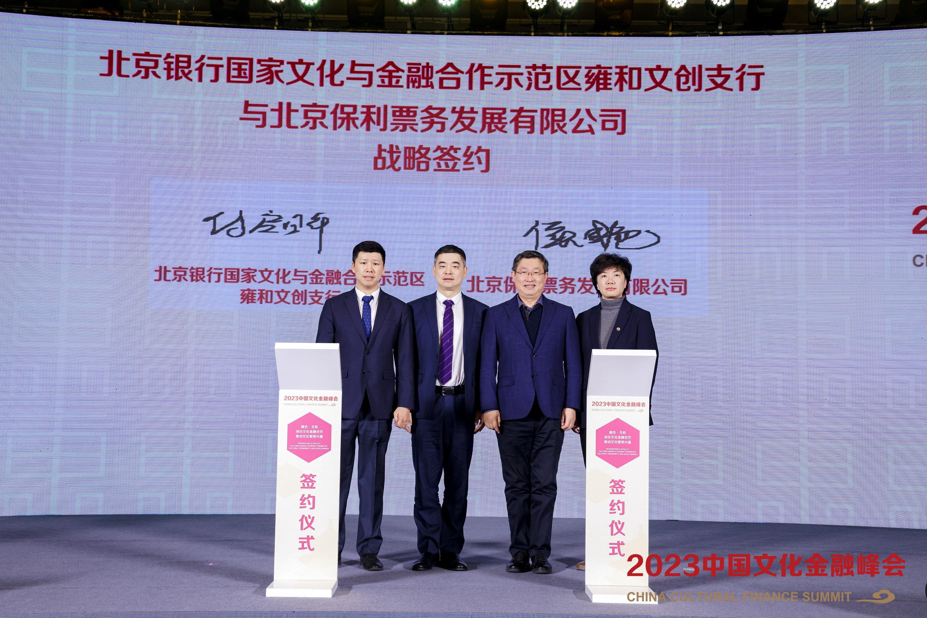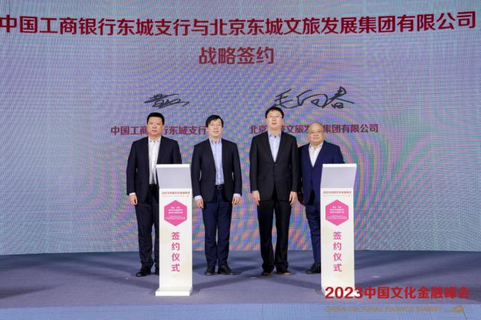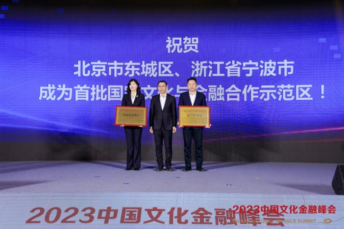开幕式上,北京市东城区和浙江省宁波市成功获评全国首批国家文化与金融合作示范区并举行了授牌仪式。中国工商银行北京东城支行与北京东城文旅发展集团有限公司,北京银行国家文化与金融合作示范区雍和文创支行与北京保利剧院管理有限公司达成战略合作,进行了现场签约仪式。