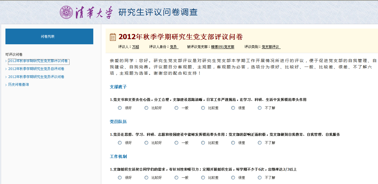 1、党支部评议问卷:研究生对党支部本学期工作开展情况所进行的评议。评议结果用于加强党支部的建设。评议内容主要包括支部班子、党员队伍、工作机制、工作业绩、党群联系等方面。