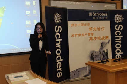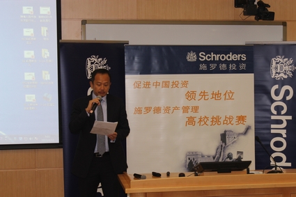 4号楼阶梯教室圆满举行,施罗德投资管理(香港)有限公司中国业务总监郭炜、大中华区人力资源部主管黄颖贤、交银施罗德基金管理有限公司人力资源部总经理陈廷超、量化投资部总经理龙向东等作为决赛评委嘉宾出席。经过前期选拔,共有五位同学晋级决赛,比赛全程以英文进行,由2012级硕士生董孜孜主持。