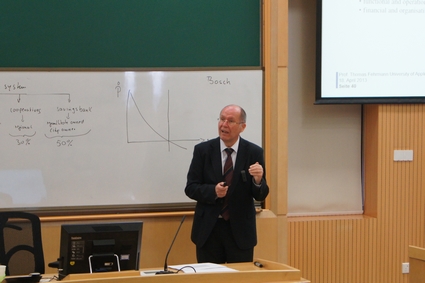 在为期10天的课程中,凯勒教授与费尔曼教授凭借自身在德意志联邦银行十数年的工作经历,向同学们展示了一幅关于欧洲货币体系的生动画卷。其中,凯勒教授以本轮全球金融危机和欧洲主权危机为切入点,辅以详实的数据、史料,深入分析了金融危机的诱发因素、发展经过、可能影响与拯救措施,其授课风格逻辑缜密又不失生动幽默。费尔曼教授的课程更侧重于中央银行理论方面,并将理论与实际相结合,介绍了整个欧元体系的运作方式以及欧洲中央银行的货币管理模式。