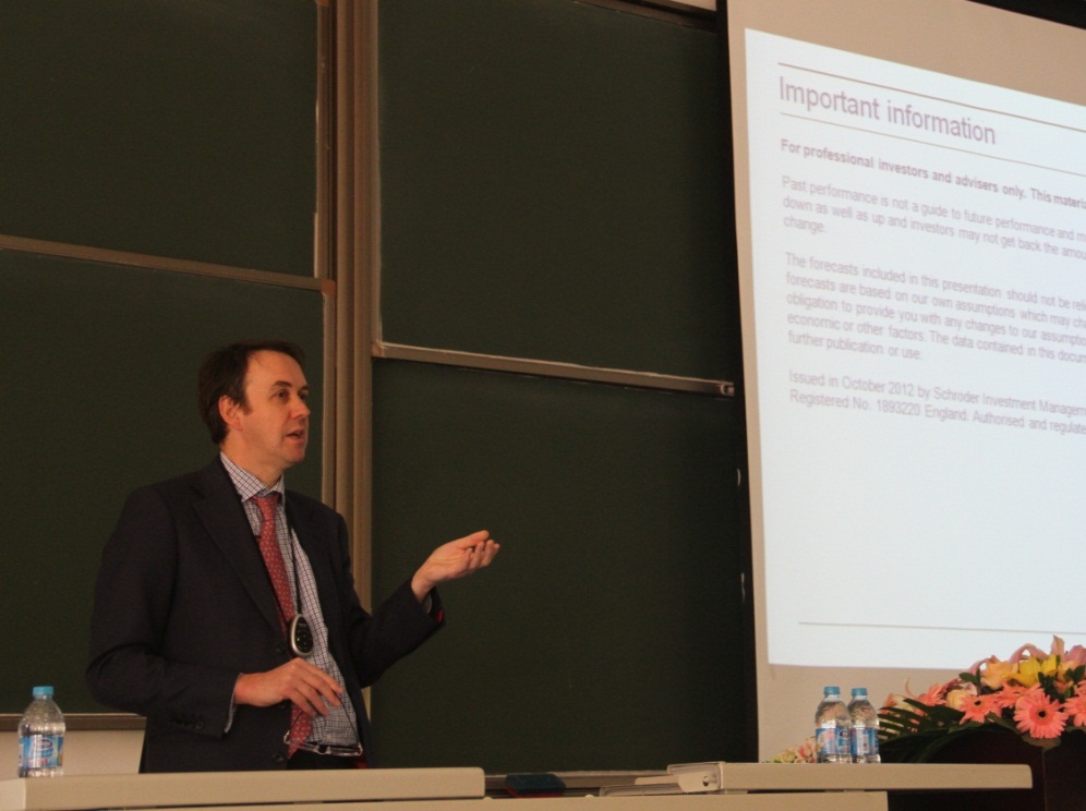 Debruyne先生对施罗德投资的业务发展及其成功经验作了简要介绍。通过他的介绍,同学们深入的了解到了施罗德投资在全球的业务分布、发展历史、在中国大陆的发展现状以及施罗德的行业地位等信息。