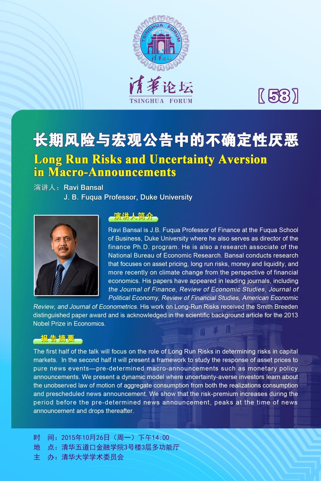 主题:Long Run Risks and Uncertainty Aversion in Macro-Announcements(长期风险和宏观公告中的不确定性厌恶) 主讲人:Ravi Bansal,杜克大学金融学教授 日期:2015年10月26日(周一) 时间:下午2:00-4:00 地点:清华p站视频 3号楼300教室 语言:英文