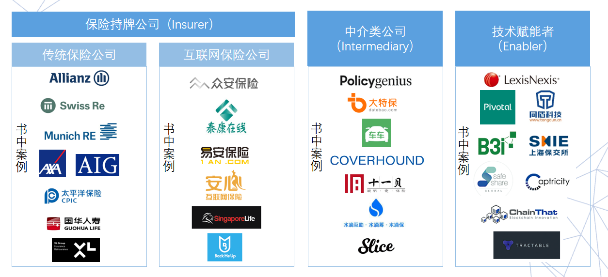 研究保险行业需要对研究对象进行分类。本书按照牌照或者企业属性,分为保险持牌公司(Insurer)、中介类公司(Intermediary)、技术赋能者(Enabler),其中又将保险持牌公司分为传统的保险公司和互联网保险公司。从企业属性的角度,报告分析四类企业如何将涉足保险科技领域:传统保险公司尤其是大型保险集团如何进行积极的数字化转型;对于一出生便是纯线上经营的互联网保险公司如何展开保险科技的探索;基于互联网的各类专业中介和兼业中介平台有哪些不同的发展路径;以大数据、人工智能、区块链为主的三类技术如何为保险行业赋能。