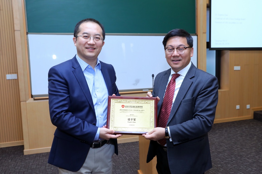 演讲不但加深了同学们对财富管理和私人银行的理解,也启发了同学们对自身生涯发展和职业素质培养的深入思考。教室内座无虚席,同学们踊跃提出了自己的问题和见解,钱于军进行了精彩的回答,并展开了深入讨论。演讲结束后,高皓为钱于军颁发了《财富管理与私人银行》课程演讲嘉宾荣誉证书。
