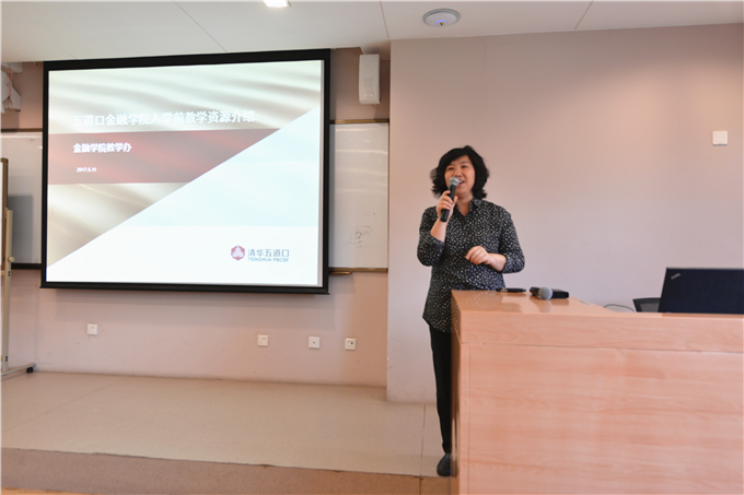 (图为金融学院教学办主任李静芳为新生们介绍学院教学资源)