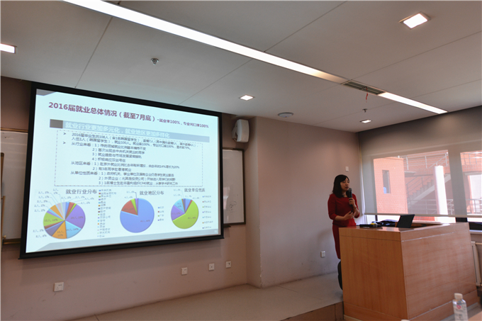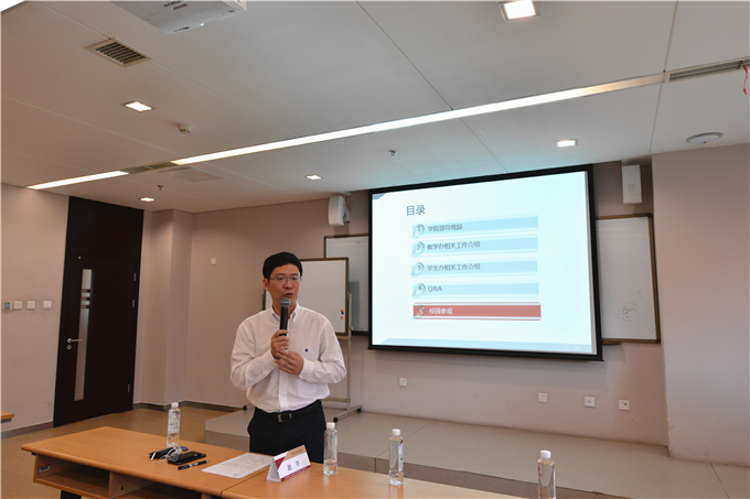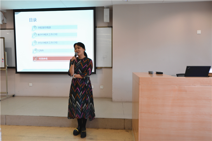 学生办副主任刘国尧为大家介绍了五道口的学生生活。小院生活丰富多彩,承载不同群体之间交流沟通平台角色的道口家庭计划加深了同学们与校友、老师之间的联系;而新生晚会、五道口学生节等文体活动则让同学们的课余生活色彩纷呈。随后,刘国尧介绍了学院职业发展情况。特色化的职业发展教育服务体系成果丰硕,目前学院已建立实习基地40余家,连续5年达到就业率100%、专业对口率100%。她鼓励同学们有效利用学院的职业发展资源,探索自己的职业兴趣与发展方向。