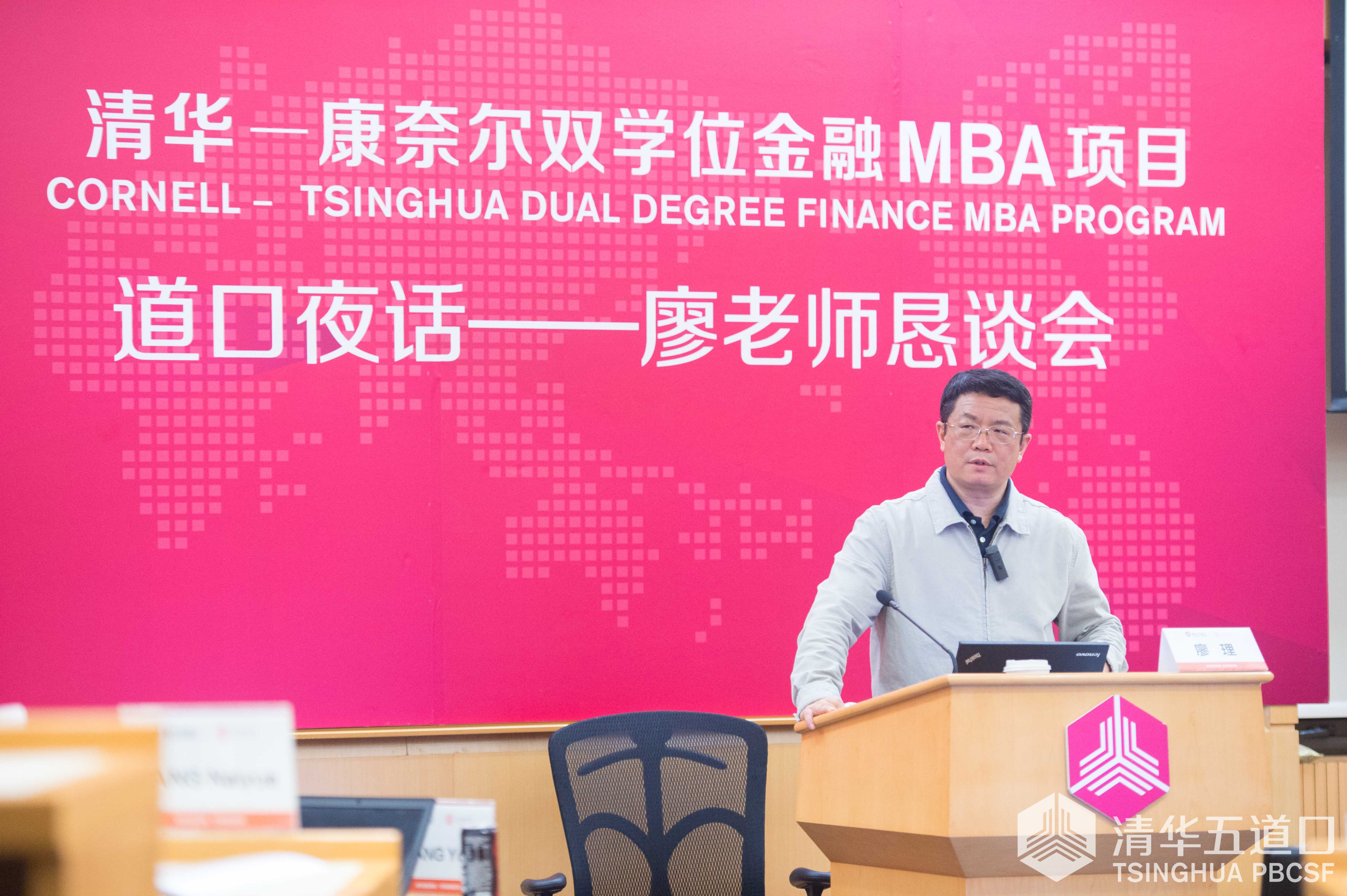 恳谈会一开始,廖理就风趣幽默地向同学们讲述了学院成立及建设伊始的故事。他介绍了学院目前的师资结构以及学院下设的各个实体研究中心,廖理认为,学术水平的高低是决定一个学术机构能否基业长青的标准,因此学院在引进全职教授、特聘教授等拥有世界先进水平的师资队伍、打造一流金融智库方面做出了很多的努力。廖理希望清华-康奈尔双学位金融MBA的同学们也能积极与各研究中心建立联系,参与学术研究工作。