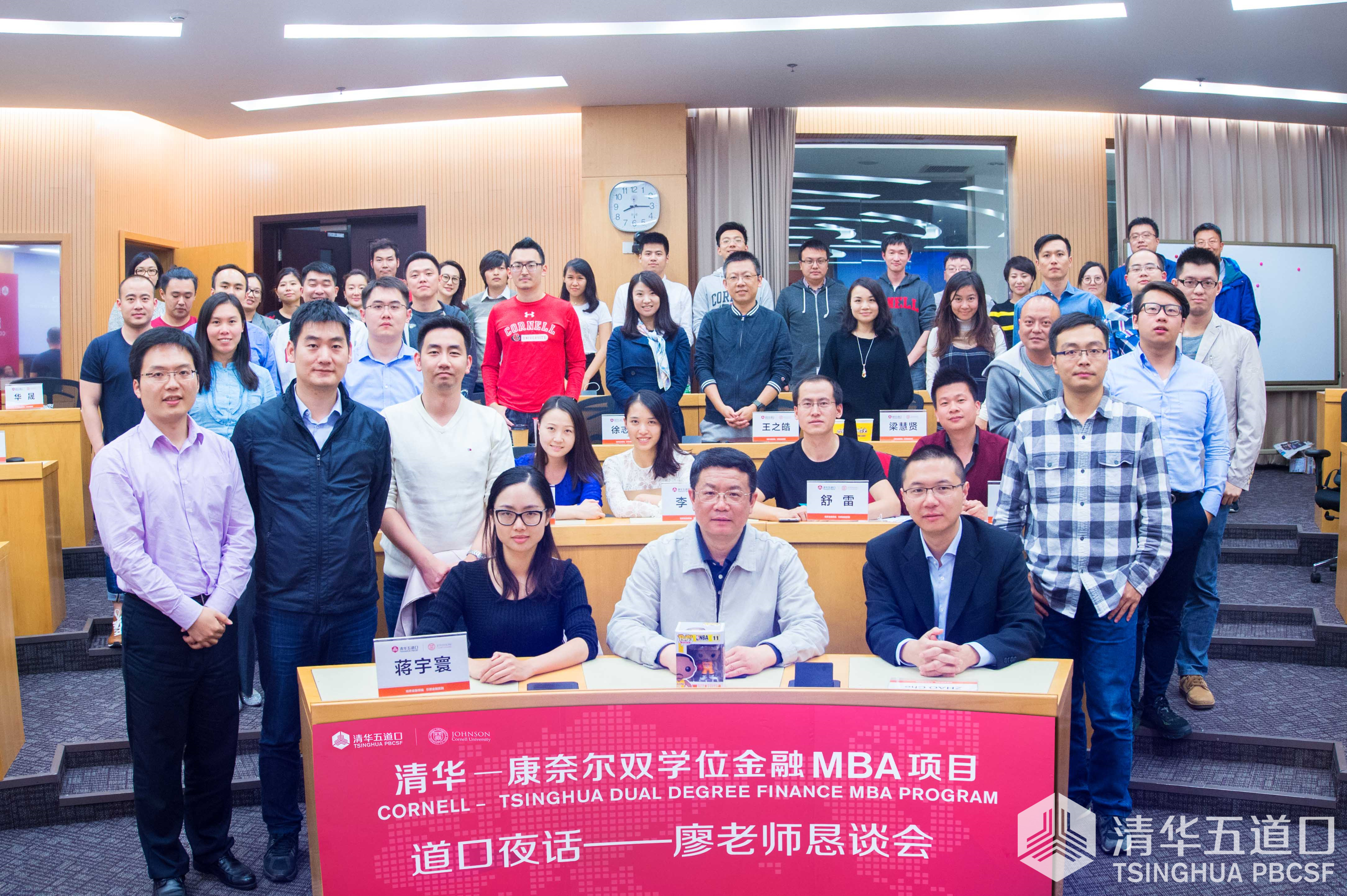 图为:清华-康奈尔双学位金融MBA首期班的全体学生与廖理、田轩合影留念