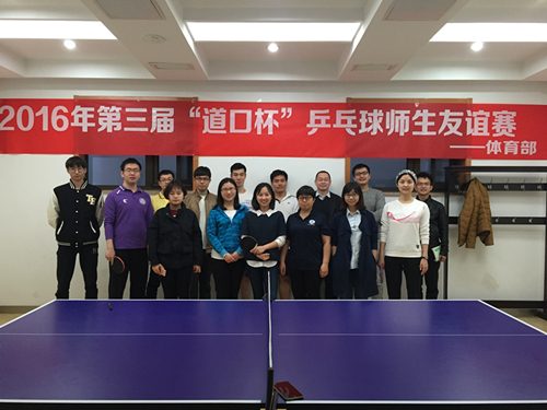 3月23日,第三届“道口杯”乒乓球师生友谊赛在学院顺利举行。王正位老师斩获男子组冠军,14级博士徐璐同学将女子冠军收入囊中,15级博士徐昊天同学、14级博士江静琳同学分别获得男、女子组亚军。最后男女冠亚军组成混双进行友谊赛,王正位、江静琳一组赢得混双比赛冠军。