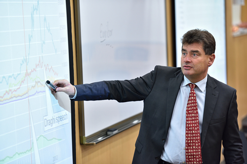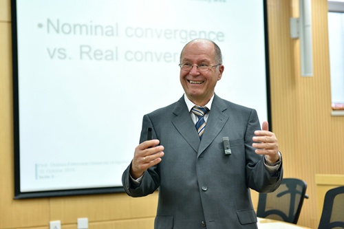 保持长期友好合作关系,该门课程作为合作项目之一,其开设已有十余年历史,专门面向研一新生。埃里希?凯勒教授和托马斯?费尔曼教授每年都会来中国授课,并感慨中国日新月异的变化。学院副院长康以同在课程开始前对两位教授表示欢迎并进行简要介绍,课程主要分为欧元区货币政策和欧债危机的监管应对两部分,由费尔曼、凯勒两名教授分别讲解,教授会根据去年教学的反馈进行课程内容和授课方式的调整。费尔曼教授运用生动的例子讲述欧元区的实践是建立在成员国的名义同质而非实际同质的基础上,这影响了欧元区统一政策的协调性。费尔曼教授十分有亲和力,他引用的关于德法“结姻”、南北欧享乐观差异的例子让课堂充满乐趣。凯勒教授系统地阐释了次贷危机和欧元主权债务危机的起因、蔓延、影响冲击和采取的政策措施。他积极鼓励学生参与发言,课堂上同学们表现活跃,表现最优的同学最终还得到一枚纪念币作为奖励。课程结束后,教授与学生进行了一对一的交流,师生在课堂合影留念。