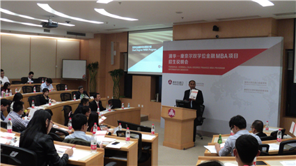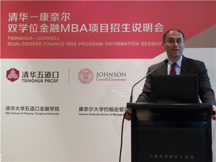 金融MBA教育中心主任蔡侃向到会听众详细介绍了清华-康奈尔双学位金融MBA项目的招生季申请情况。