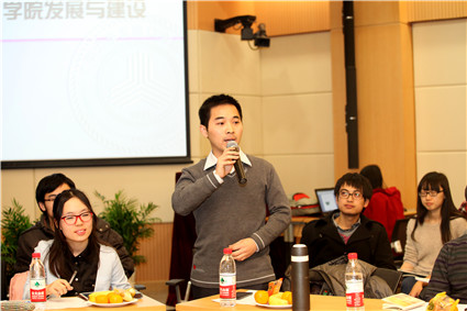 2013级硕士生厉金鑫首先代表新生,从当前的学习、文体、生活等几方面状况向学院领导做了汇报,并对学院领导和老师一直以来的关心和爱护表达了感谢。