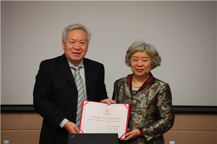 图为吴晓灵为学术顾问委员会主席顾秉林颁发聘书