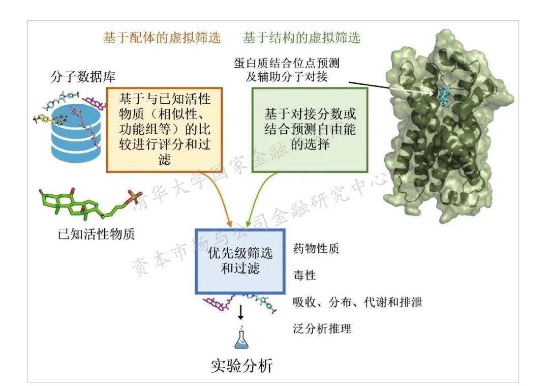 在药物设计和药物发现中,虚拟筛选(Virtual Screening,VS)是CADD的重要方法之一,是从化合物库中筛选出有前景的治疗化合物的有效方法(如图2-5所示),以针对目标筛选具有所需活性的化合物。
