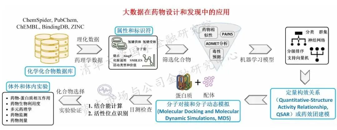 如图1-2所示,在新药研发中,第一步也是最重要的一步是确定与疾病病理生理学有关的适当靶点(如基因、蛋白质),然后找到可以干扰这些靶点的药物或类药物分子。人工智能的发展可以帮助提取这些大型生物医学数据集中存在的有用特征、模式和结构。在确定和验证了合适的靶点之后,下一步是寻找合适的药物或类药物分子,这些分子可以与靶点相互作用并引起所需的反应。在大数据时代,通过支配海量的大型化学数据库,协助寻找针对特定靶点的完美药物。