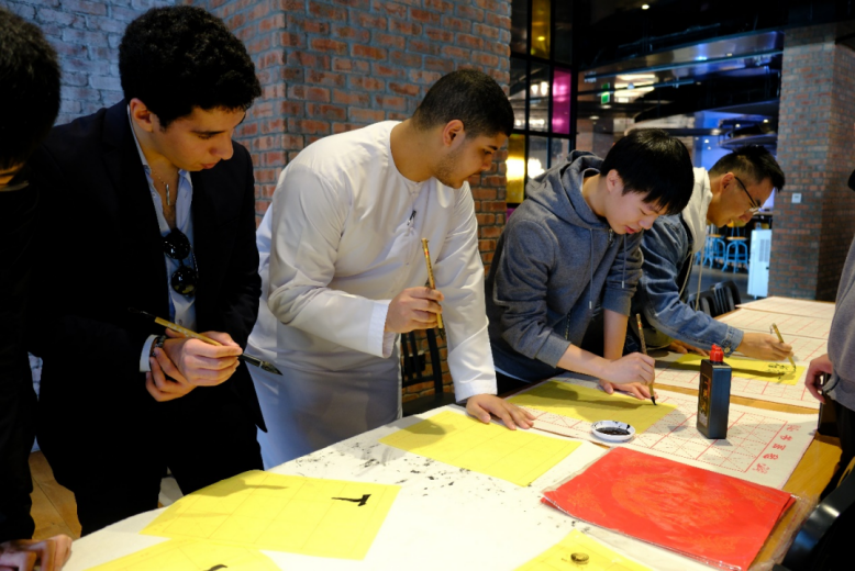 图为刘腾渊(右二)在纽约大学阿布扎比分校与学生交流中国书法艺术
