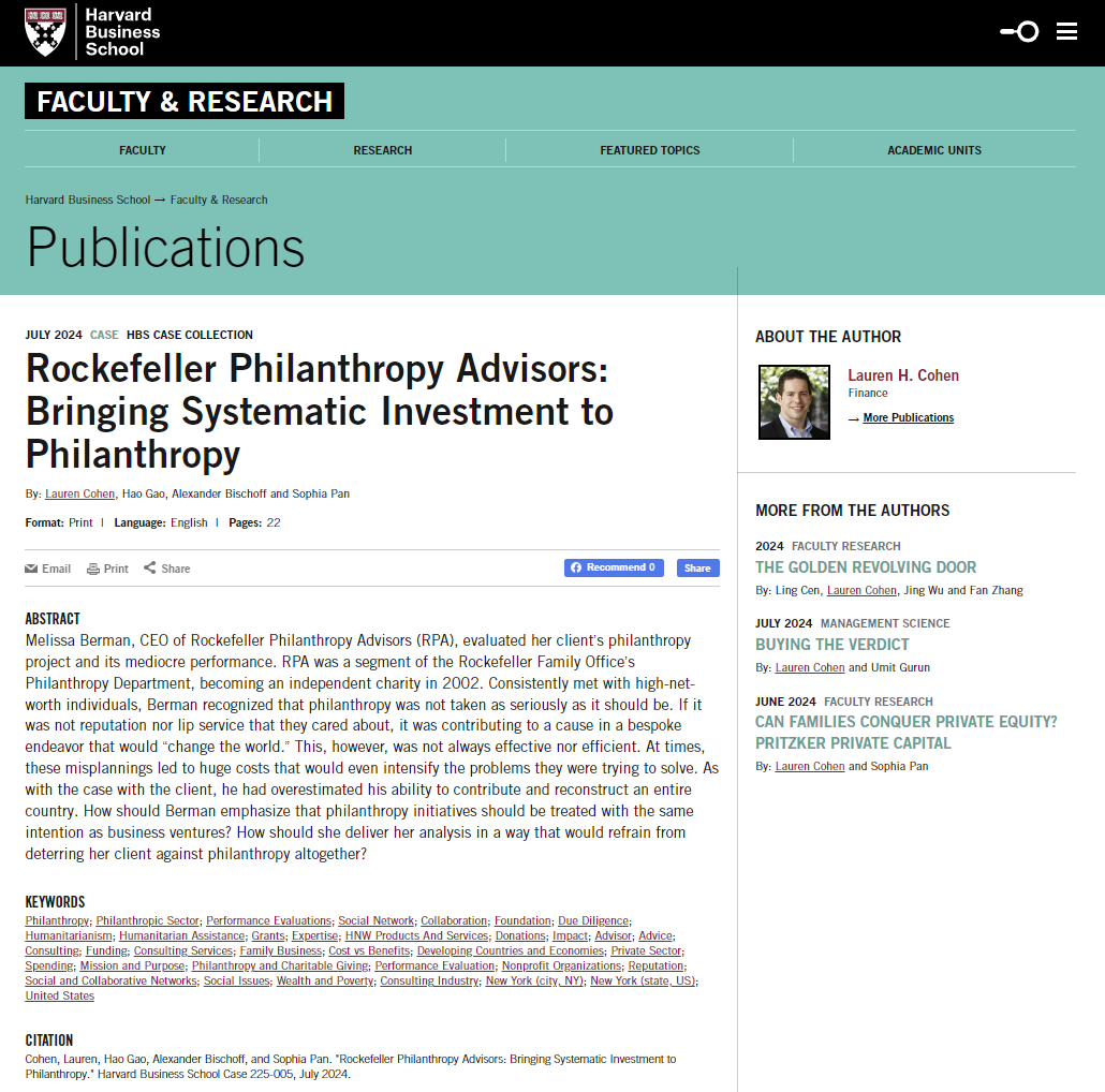 EMBA学生Alexander Bischoff、哈佛商学院案例研究员Sophia Pan合著的案例《洛克菲勒慈善咨询:将系统性投资导入公益慈善》(Rockefeller Philanthropy Advisors: Bringing Systematic Investment to Philanthropy)被哈佛商学院案例库收录(收录号:HBS Case 225-005)。