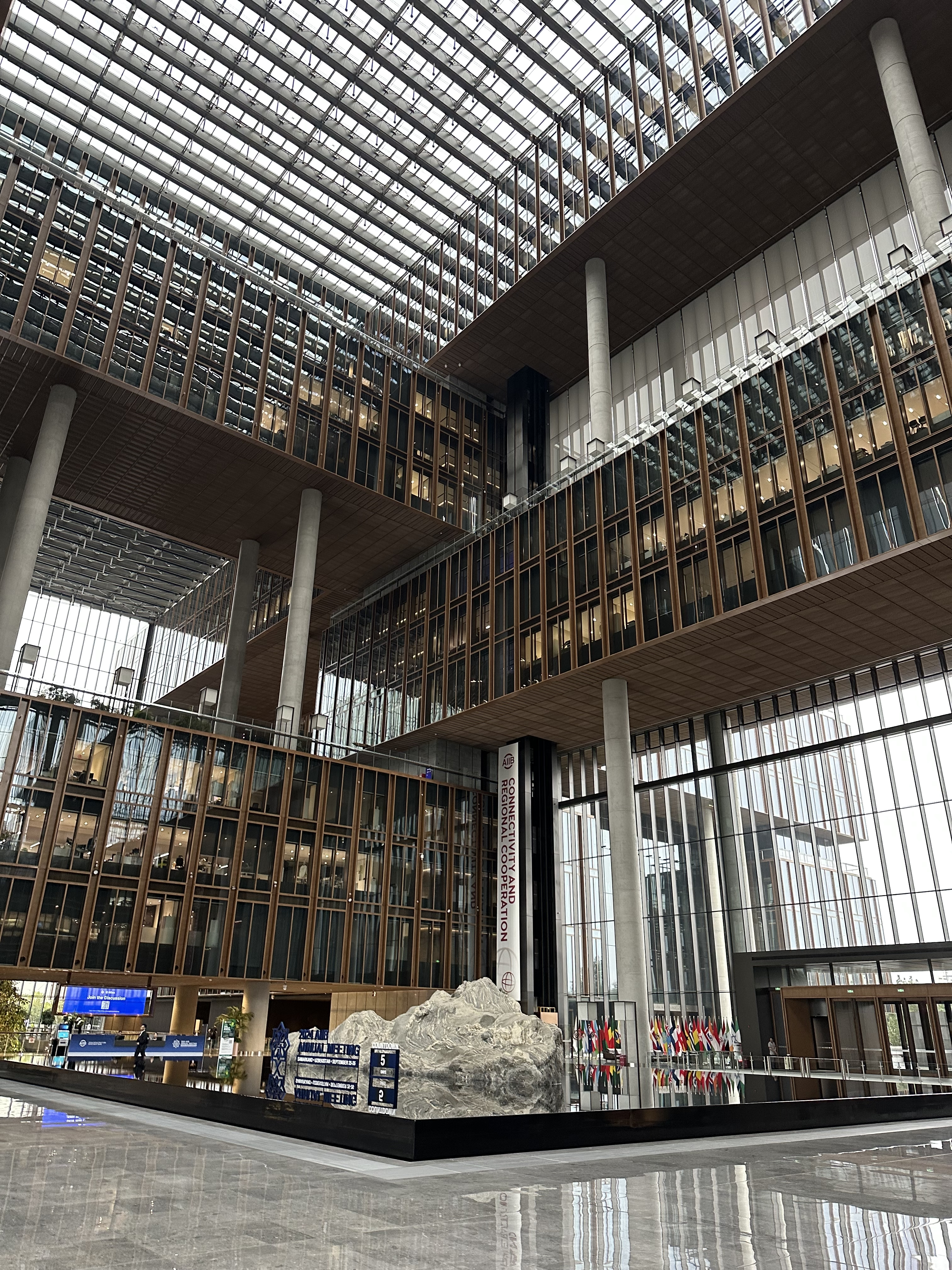 在亚投行工作人员的带领下,学院师生参观了亚投行的办公区域、健身区和展厅。工作人员展示了亚投行总部大楼的绿色建设理念及其独特的中西融合建筑风格,进一步加深了师生对亚投行核心价值观“绿色发展”的理解与认同。