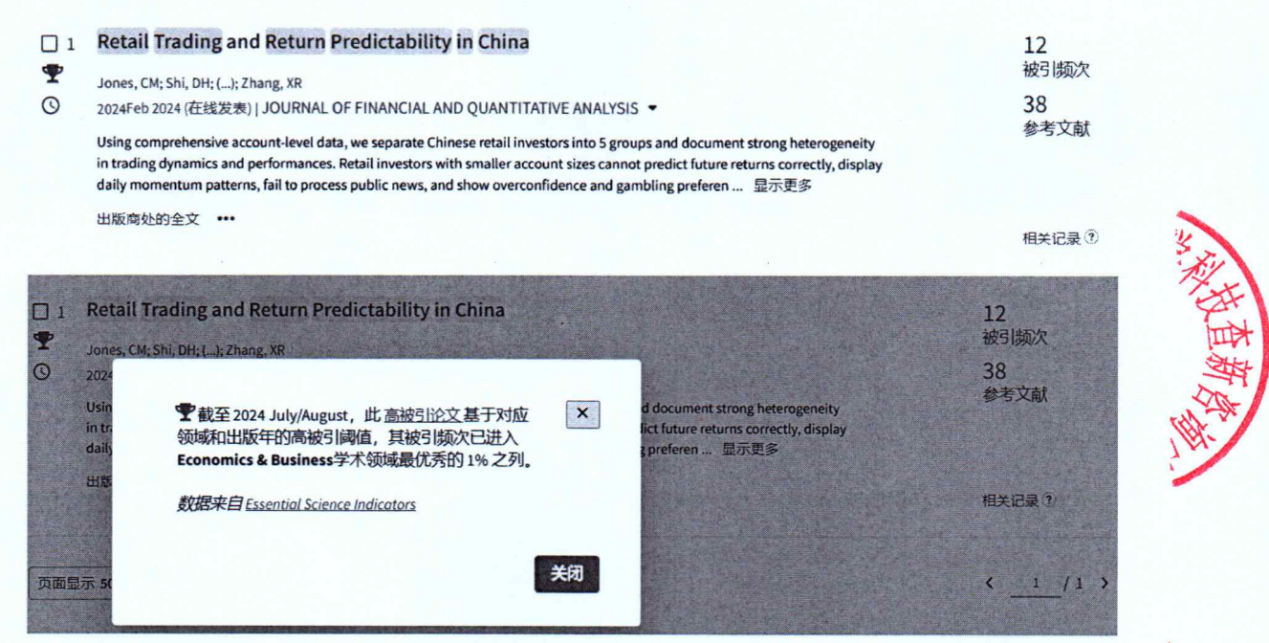 副院长、金融学讲席教授张晓燕与合作者哥伦比亚大学查尔斯·琼斯(Charles M. Jones)、复旦大学施东辉、中央财经大学张欣然2024年发表在金融学国际顶级期刊《金融与定量分析杂志》(Journal of Financial and Quantitative Analysis)的论文《中国散户交易与收益率预测》(Retail Trading and Return Predictability in China)被引频次进入ESI Economics & Business学术领域最优秀的1%之列。