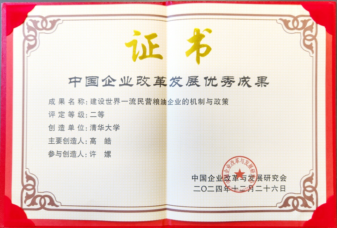 全球家族企业研究中心主任高皓团队撰写的论文《建设世界一流民营粮油企业的机制与政策》荣获中国企业改革发展优秀成果二等奖。