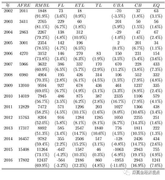 在2007-2009年全球金融危机期间,中国影子银行业务激增。表1显示了两款影子银行的典型业务和产品的发行规模:委托贷款和信托贷款。两者的发行总量分别从2006年的2700亿元和830亿元增长到2013年的25470亿元和18400亿元,分别占2013年度实体经济总融资规模的14.7%和10.6%。相比之下,企业债券和股票在2013年的净发行量仅分别为18110亿元和2220亿元。