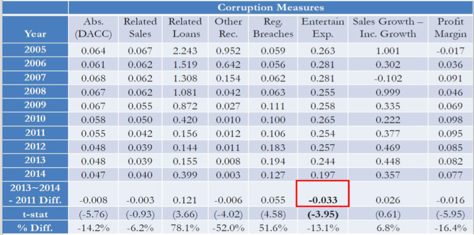 第三篇文章,针对反腐运动非常流行的说法,把它考虑成是帮派斗争政治斗争,究竟是不是这样?把中纪委调查的有关企业拿来看一看,特别是调查前两年,企业是不是更腐败还是跟别人一样,我们做一下对比就对观点产生结论,这个过程是怎么样?我们看一看企业治理中腐败的可能指标,自我交易,自我贷款给大股东,盈余管理,看看被调查的企业和对比的企业有什么区别。明显被调查企业在2012年之前,甚至两年之前,他的自我交易,自我贷款,就比同类企业要多,腐败的征兆在调查前两年之前就是比这个行业的平均值显著的高出。利润很少,但是经营收益特别高,这也是企业的一种不规范的指标。还有网络上对这个企业有没有腐败的帖子。这些都说明这个企业今天被调查,但是两年之前各种反应腐败的指标都是高于同样的同类企业。确实被调查的企业是更腐败的。于是,反腐效果是不是显著,到目前来讲短期效果是不显著的,为什么?2012年以后反腐后,在所有这些企业公司治理不好的指标,自己贷款,自我贷款,自我交易,盈余管理等等,都没有显著的改进,唯一显著的改进是招待支出,因为八项规定。反腐是针对腐败企业,但是效果不是特别的明显。最后一篇研究报告的证据显示,2012年起来的反腐是针对更腐败的企业,并没有不支持政治上的打压,缺陷是短期内反腐对企业行为的改善比较少,只体现在招待支出减少上,其他方面不够。