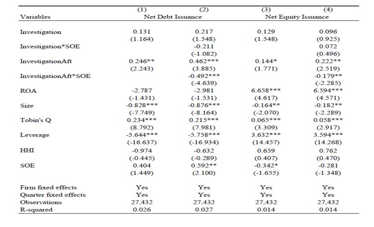第二个研究,如果调查一个企业,比如中石油,对中石化有什么影响?或者对整个的石油行业其他的50家企业会有什么影响?这个也是很重要的,能够澄清道听途说的流行说法。一般来讲,做一个简单回归,看企业新发债和新发股票与中纪委的调查关系,这是对整个行业的影响。中纪委的调查和国企的交叉项,如果是国企,调查影响是什么,如果对比这两个的话,如果调查某国企,同等类型的国企,新发债数量和新发股票的数量都显著下降。但是整个行业,特别是整个行业里非国营企业,这两个之差,行业或者行业里的非国营企业的发债和新股发行是显著增加。在国营企业内部,反腐调查有很强的传染效应,如果影响一个企业也会影响同类的国营企业。对于民营企业来进,或者这个行业整个其他的企业来讲是竞争效应。国营企业被调查后,可能暂时很难从银行拿到贷款,但是其他企业趁机市场份额开始上升。所以第二篇文章揭示反腐积极意义,和大家所道听途说的国进民退的印象实际是相反,你把数字仔细看一看,2012年以后确实有明显的国退民进的现象。