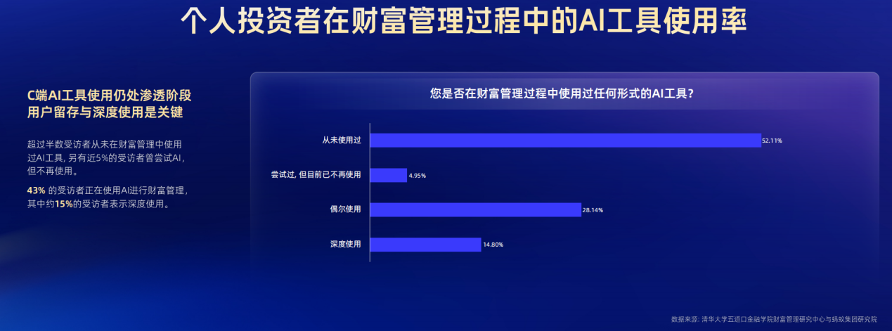 财富管理研究中心近期与蚂蚁集团研究院联合开展了主题为AI财富管理在中国个人投资者和机构投资研究端用户中的应用现状与发展趋势的线上调研。结果显示,在C端用户中,深度使用AI进行财富管理的比例仅为14.8%,仍有巨大增长空间。用户普遍看重AI“随时在线、个性化建议、降低理财门槛和处理海量数据”的优势。与此同时,部分用户明确表示希望AI能提供“情绪陪伴”,这表明AI在财富管理中的角色正在突破“工具”边界,逐渐转向“伙伴”。在痛点方面,张晓燕指出,一些用户对AI理财产品提出了“内容冗长”“话术化”“能力不足”和“带有销售倾向”等问题。这表明行业在产品设计上必须注重实用性、中立性和透明度,避免损害用户体验。