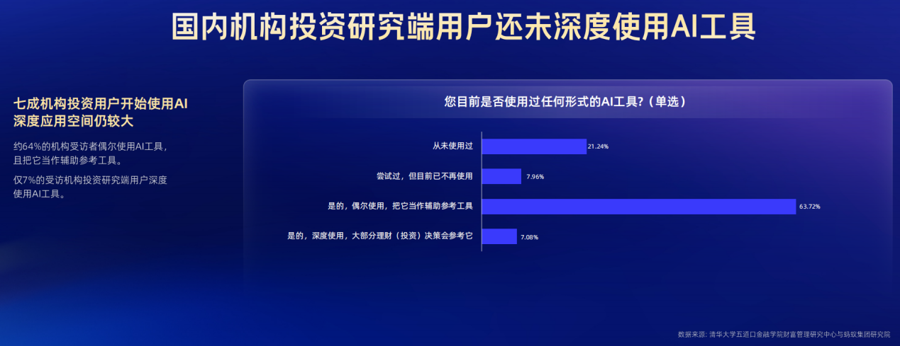 在B端投研人员的反馈中,调研结果同样显示了AI应用的潜力与挑战。张晓燕表示,虽然有63%的投研人员在工作中偶尔使用AI,但深度使用比例仅为7%,而超过20%的受访者从未使用过AI。投研人员普遍希望AI能够在信息筛选、周报撰写、数据清洗等重复性工作中发挥作用,并期待未来的AI工具能够实现自动推送信息、生成研报初稿和挖掘交易信号等更高阶功能。这些需求为行业发展指明了方向。