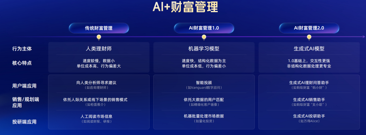 张晓燕表示,人工智能技术正在让财富管理领域发生深刻的变革。回顾财富管理的发展历程,大体可以分为三个阶段:传统财富管理、AI财富管理1.0以及AI财富管理2.0。在传统阶段,财富管理服务高度依赖理财经理个人的知识和经验,服务范围有限,质量难以统一。进入AI财富管理1.0后,机器学习和结构化数据处理被引入,成本大幅下降,服务覆盖面显著扩展。然而,由于技术能力有限,1.0阶段的服务仍然以标准化和初级化为主。