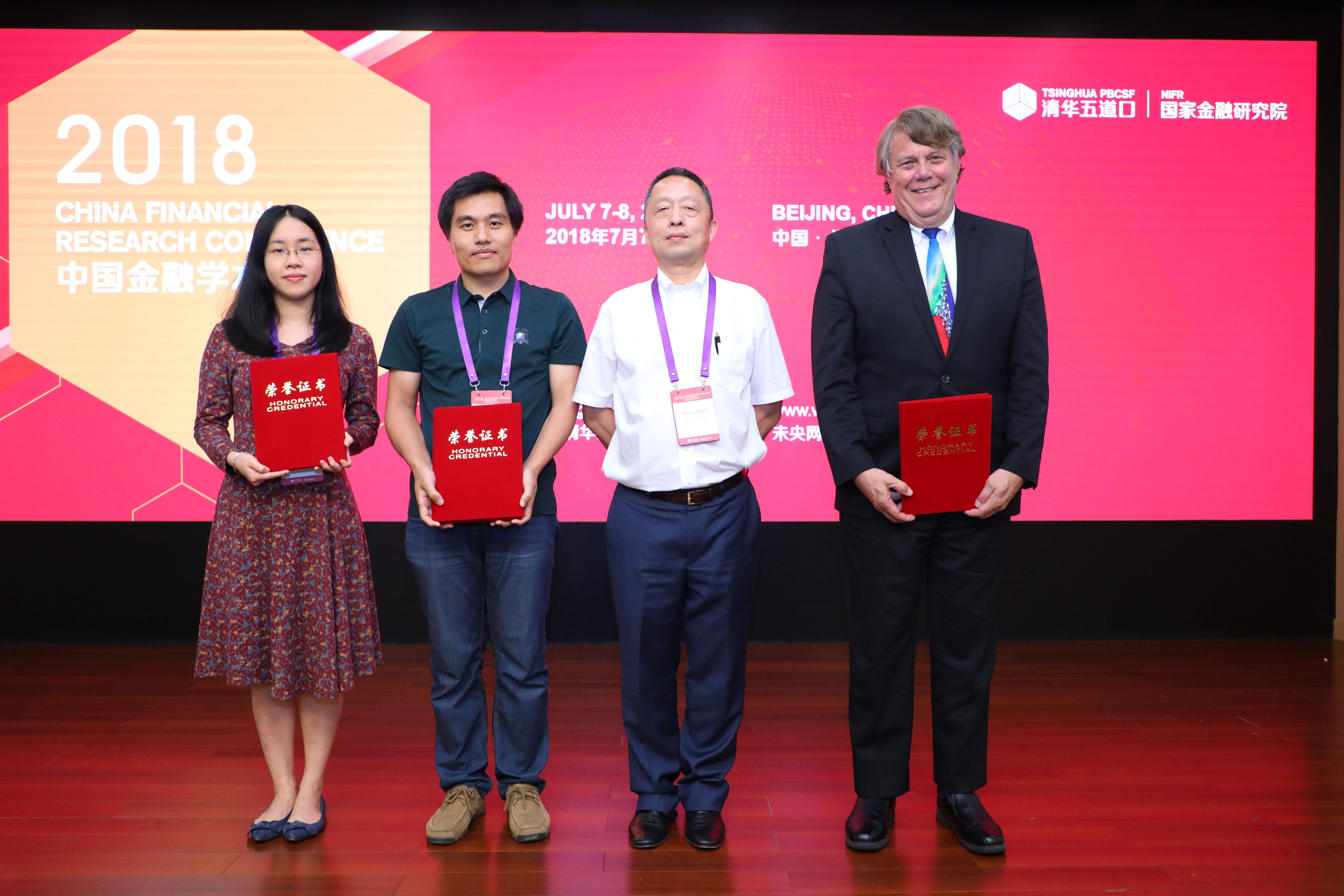 图为新结构金融学最佳论文奖(左一,江静琳;左二,王正位;右一,威廉·麦吉森;右二,周皓)