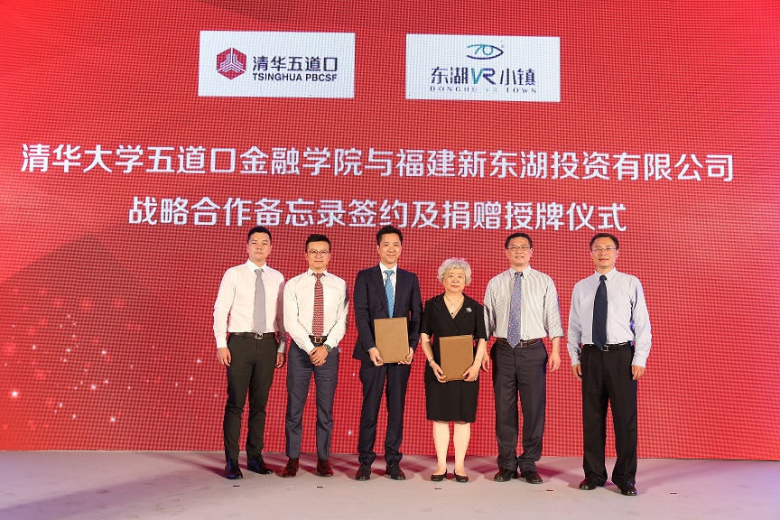 杰出教育贡献奖”。福建新东湖投资有限公司董事长陈国平还作为校友代表致辞。他在发言中回顾了公司以往取得的成绩,并介绍了公司的战略规划,对学院未来发展致以诚挚的祝福。常务副院长廖理、党委书记顾良飞及东湖VR小镇两位副总经理林潮、王中雷见证了双方签约协议。