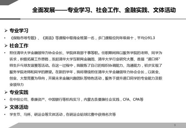 第三届行业研究大赛等大型活动,并与业界保持积极联系。这段社工经历对我来说弥足珍贵,组织协调能力再也不是挂在嘴边的一句空话,而是用心去感悟的品质。我也发自内心的认同:在金融领域取得成绩,拥有扎实的专业基础只是万里长征第一步,更重要的是能够有效调动他人、高效管理自己,以责任和感恩之心走好成长的每一步。