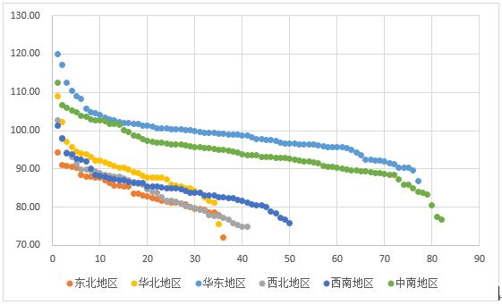 从南北方来看,无论是总体指数还是分类使用和质量指数,新市民数字金融服务南方城市(176个)优于北方城市(145个),但质量指数差距不大。分大区来看,华东地区表现最优,其次为中南地区,但是两地差别不大,均明显高于其他地区。并且,在使用指数和质量指数两个方面的排名中,华东和中南两个区域也明显高于其他区域。相对来说,东北和西北地区的整体表现落后,整体分值处于各区域底部。