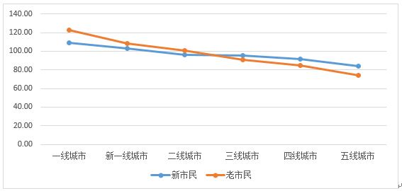 从总指数来看,一线城市、新一线城市和二线城市的总指数和分指数均显著高于三、四五线城市,城市新(老)市民数字金融服务水平与城市层级正相关。