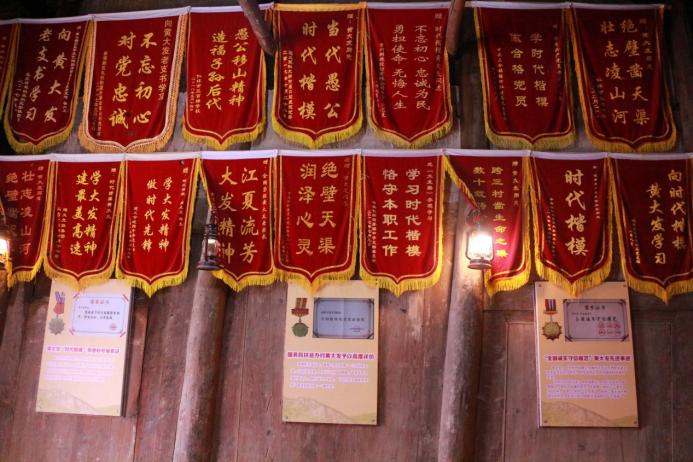 实践支队来到大发渠党性教育陈列馆(黄大发故居),看到“七一勋章”、“时代楷模”、“全国劳动模范”等荣誉奖状挂满了黄大发的老屋,其中不乏各地慕名而来学习、参观的人送来的锦旗。