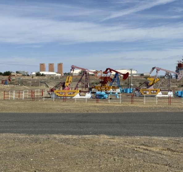在准噶尔盆地西北缘,南起红山油田,北至乌尔禾风城,全长150公里的狭长区域中坐落着一片充满生机与历史沉淀的土地—百里油区。1957年至1960年,石油人先后在乌尔禾一带发现了白碱滩高产区、百口泉油田、乌尔禾油田、红山嘴油田等,共探明含油面积290平方公里,使克拉玛依油田一跃成为当时全国最大的油田。在这里,有新中国第一口高产油井、巍峨的钻井塔、密集的抽油机、忙碌的输油管道……更有数不尽的奋斗故事和历史遗迹。这片壮观的工业景观,是整个克拉玛依的缩影,汇聚了各族同胞在无比恶劣的环境中共同劳动的汗水,见证着这座石油工业城市的辉煌成就。站在观景台上,支队成员仿佛能听到地下深处油气流动的声音,感受到这片土地上蕴藏的巨大能量。放眼望去,漫山遍野尽是橙黄色的磕头机(钻油机),一二三四五……数不尽的磕头机不规则地散落在茫茫戈壁上,永不停歇地运作着,每一台都日以继夜不断重复着嗑首抬头的动作,每一次嗑首抬头,都是对大自然的掠取,也是对人类的恩施。