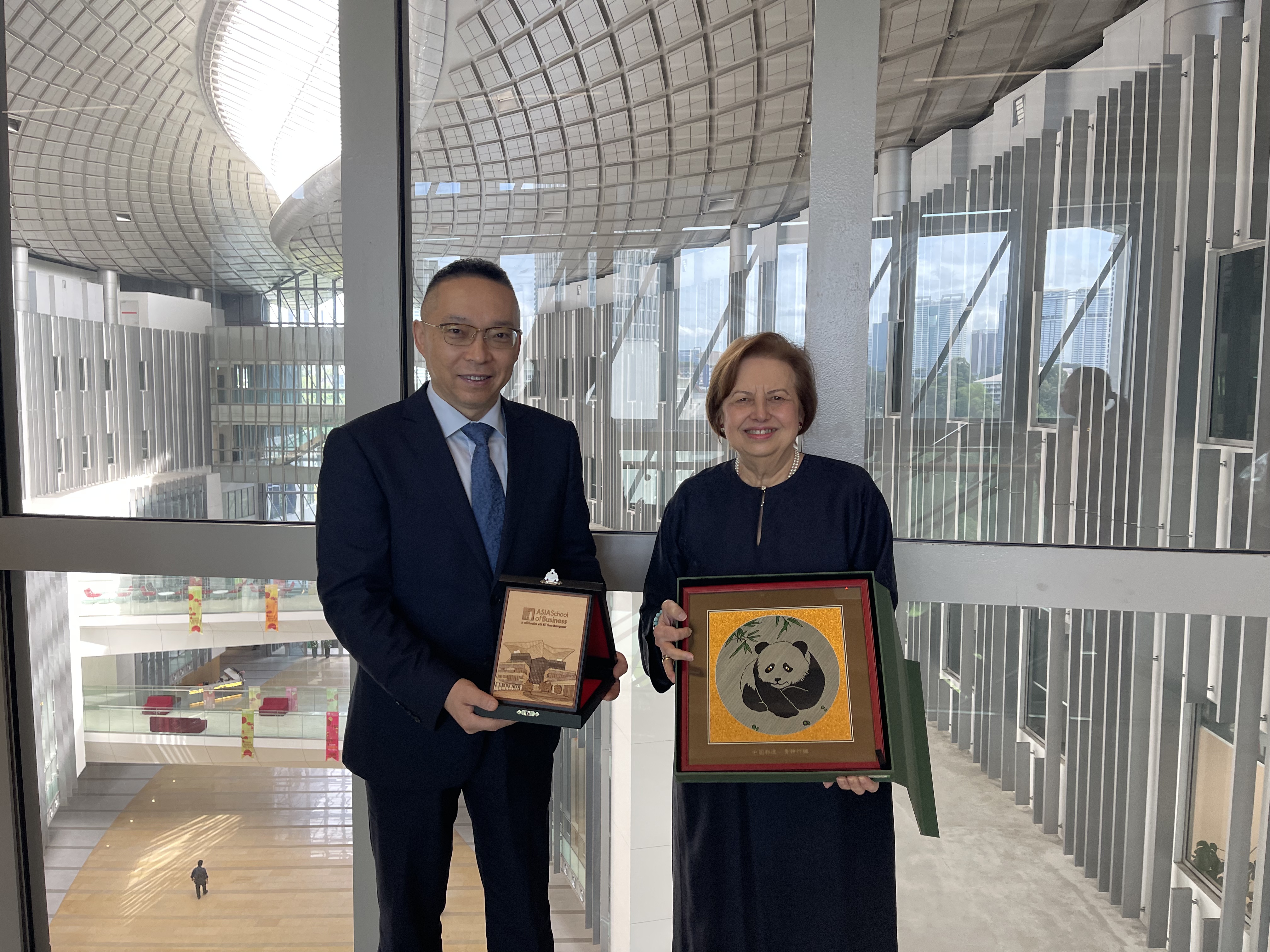 图为焦捷(左)与亚洲商学院创始主席兼联合主席、马来西亚中央银行前行长泽蒂·阿赫塔尔·阿齐兹女士(右)