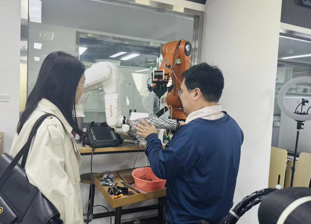 图为陈钰参观考察清华未来实验碳纤维机器人项目